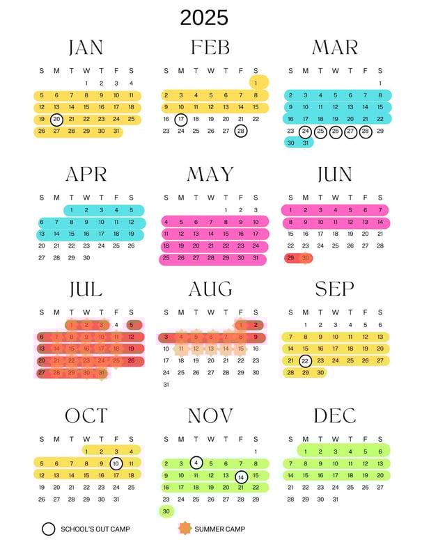 Our 6-week classes are a series of 6 classes that happen over the course of 6 weeks. For example, if you sign-up for a Monday Wheel-Throwing class, you will have classes every Monday for 6 consecutive weeks, assuming there are no holidays or breaks (they would be listed). We offer 6 class sessions each year, and you can find them highlighted in the image here or listed below. PLEASE NOTE we have a two week change over in between each session, and a four week break in mid August through the first week of September.
