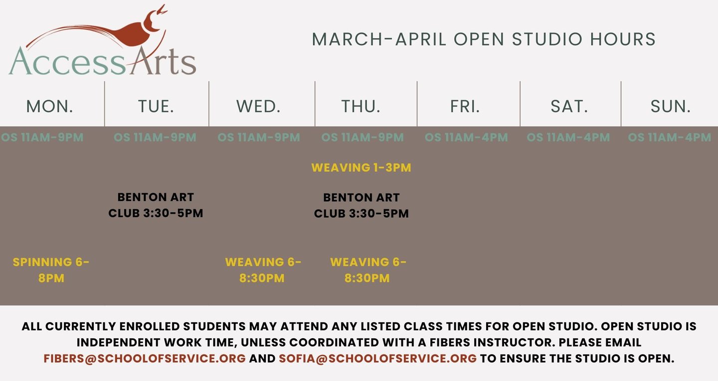 Please Note: If you require any special accommodations for your class, please get in touch with our Fibers studio manager at FIBERS@schoolofservice at least 2 weeks before the start of your class so we can make appropriate arrangements to accommodate you.